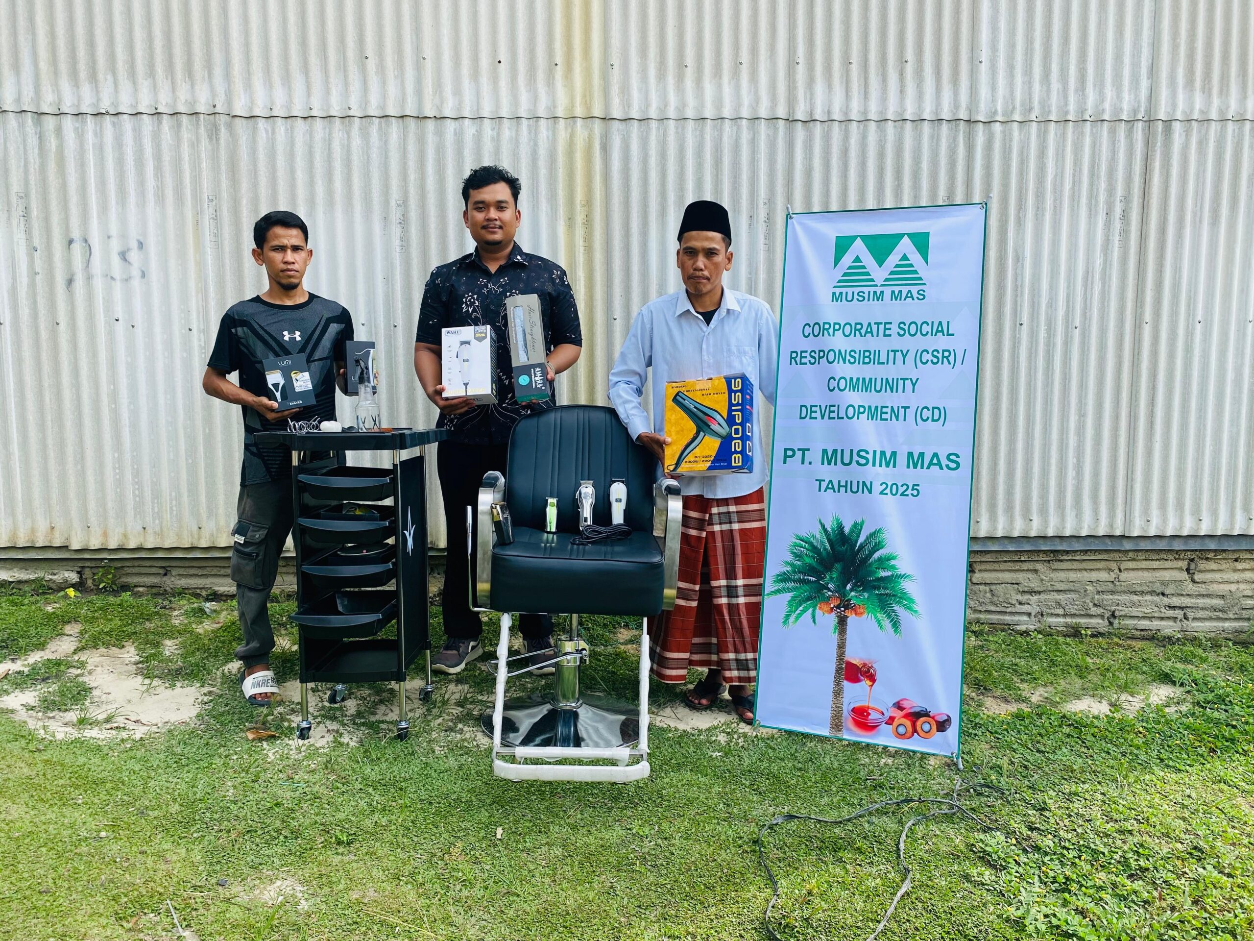 Beberapa waktu yang lalu juga kami menerima bantuan dari PT Musim Mas berupa 1 (satu) set alat alat pangkas rambut yang diberikan kepada pemuda yang juga bertujuan untuk menambah pendapatan/ekonomi pemuda. Tutup Sekdes.