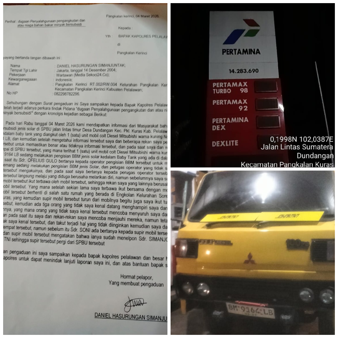 SPBU 14.283.690 yang terletak di jalan lintas Timur, Desa Dundangan, kecamatan Pangkalan Kuras, Kabupaten Pelalawan di laporkan ke Polres Pelalawan, Rabu, 04/03-2026.