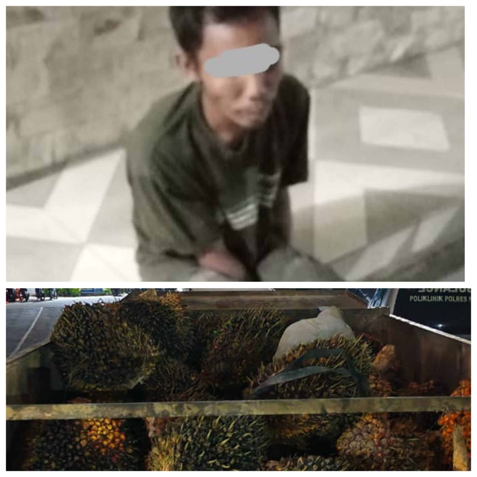 Tersangka J I, 40 tahun beragama Islam, dan berprofesi sebagai petani. Ia diamankan setelah dilakukan penggeledahan dan ditemukan barang bukti berupa 110 tandan buah kelapa sawit, Berat bersih 1440 Kg dengan harga sawit saat ini Rp. 3.300 per Kg, total kerugian sejumlah Rp.4.752.000, 1 buah tojok, 5 buah keranjang rotan, dan 1 buah timbangan gantung manual.